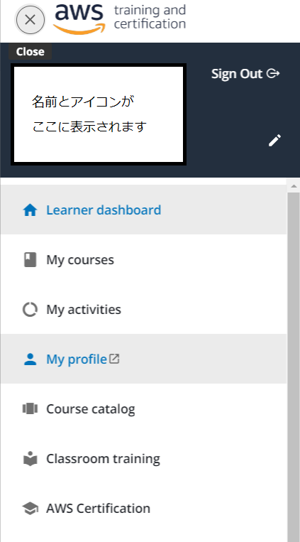 ①AWS Skill Builderのダッシュボードへログインし、左側のハンバーガーメニューを選択