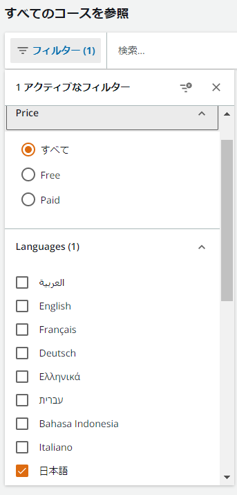 コース検索から、日本語コースのみをフィルタリングして検索することもできます。